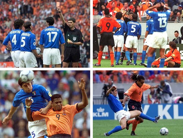 Dalle parti di Zambrotta, invece la situazione precipita. Perché juventino arranca contro l’irruenza di Zenden. Ma anche perché gli orange si trovano spesso in superiorità numerica per gli avanzamenti di Van Bronckhorst, che costringono Cannavaro ad allontanarsi dal presidio dell’area azzurra. L’ispirato Bergkamp nel frattempo, al 14′, fa secco Iuliano sulla sinistra e va a colpire il palo. Accade quindi che Zambrotta si faccia sistematicamente superare da Zenden, rimedi due ammonizioni in 19 minuti (al 15′ e al 34′) e si faccia cacciare via. Un episodio che con il senno di poi si scoprirà aver dato una svolta alla partita.