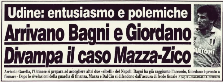 Il 25 settembre, Bagni sembrava destinato a un malinconico finale di carriera sul divano di casa, col ginocchio che gemeva tra il corridoio e il salotto. Ma il 4 ottobre esplose una nuova bomba di mercato: l’Udinese di Pozzo annunciò l’acquisto di Bagni e Giordano. I termini dell’accordo erano chiari: prestito per un anno con diritto di riscatto, 650 milioni di ingaggio pagati dal Napoli, 150 milioni di prestito all’Udinese, più 50 milioni netti di bonus al giocatore.